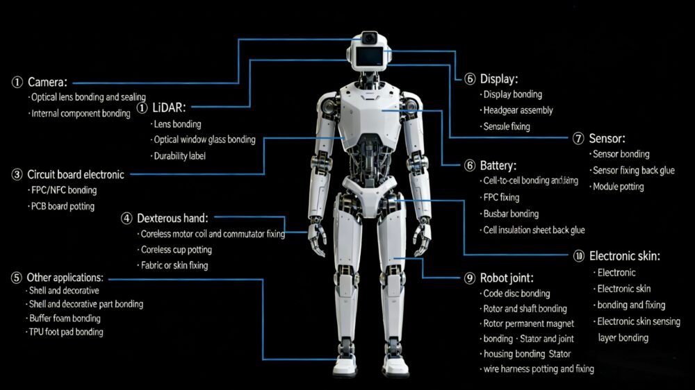 • Structure & Interface: Our adhesives assist in bonding fabric or synthetic skins to robotic substrates and affixing TPU foot pads, combining strong adhesion with necessary compliance for real-world interaction.